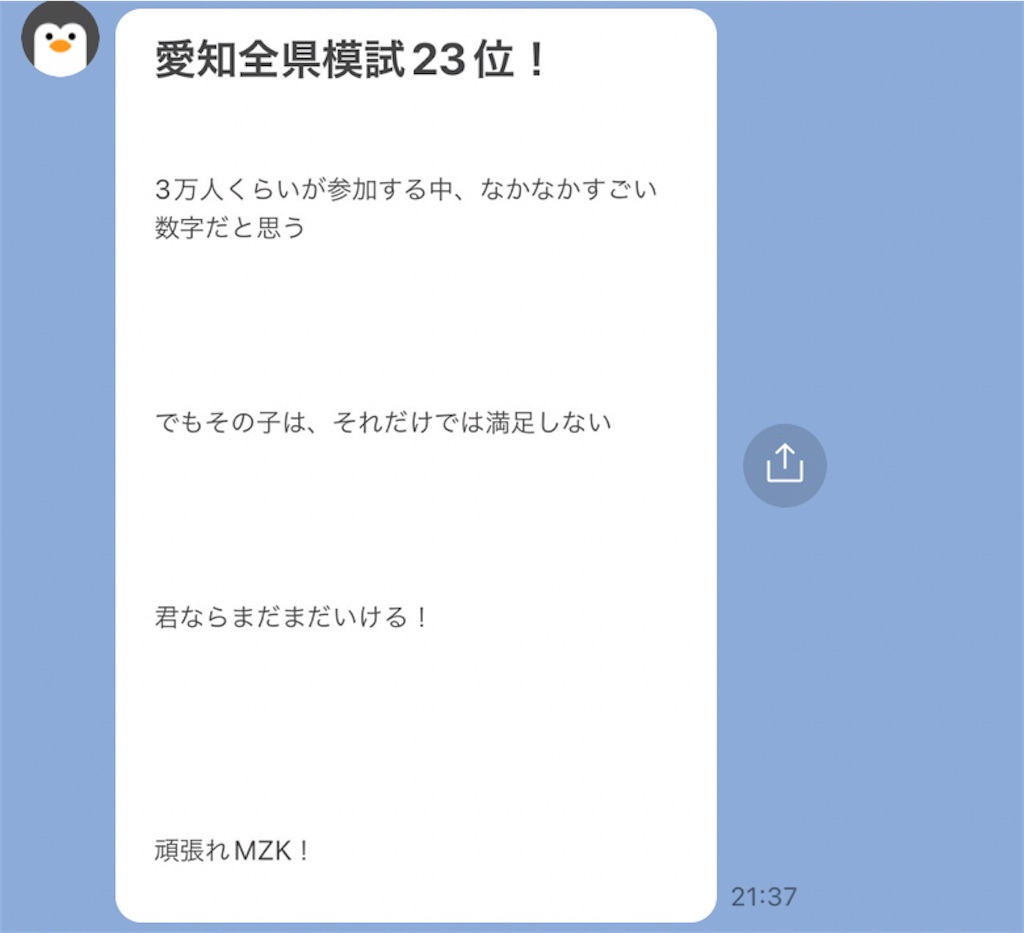 愛知全県模試で中3愛知松江っ子が全県23位を取った。
